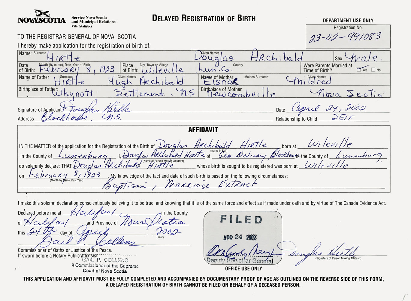 I hereby make application for the Registration of Birth of Douglas ArchibaldHirtle Sex Male