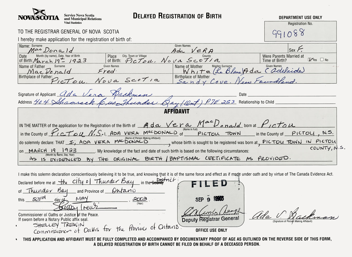 21. Name and Post Office address of Informant Ada Vera Backman 404 Shamrock Cres. Thunder Bay Ontario