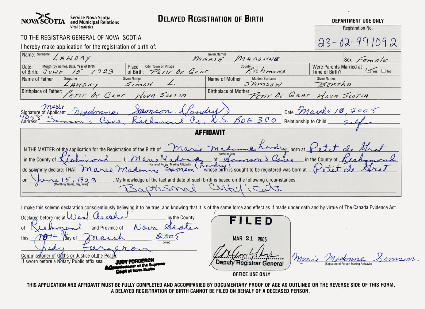 Signature of Applicant Marie Madonne Landry Address of Applicant Samsons Cove Date March 10, 2005