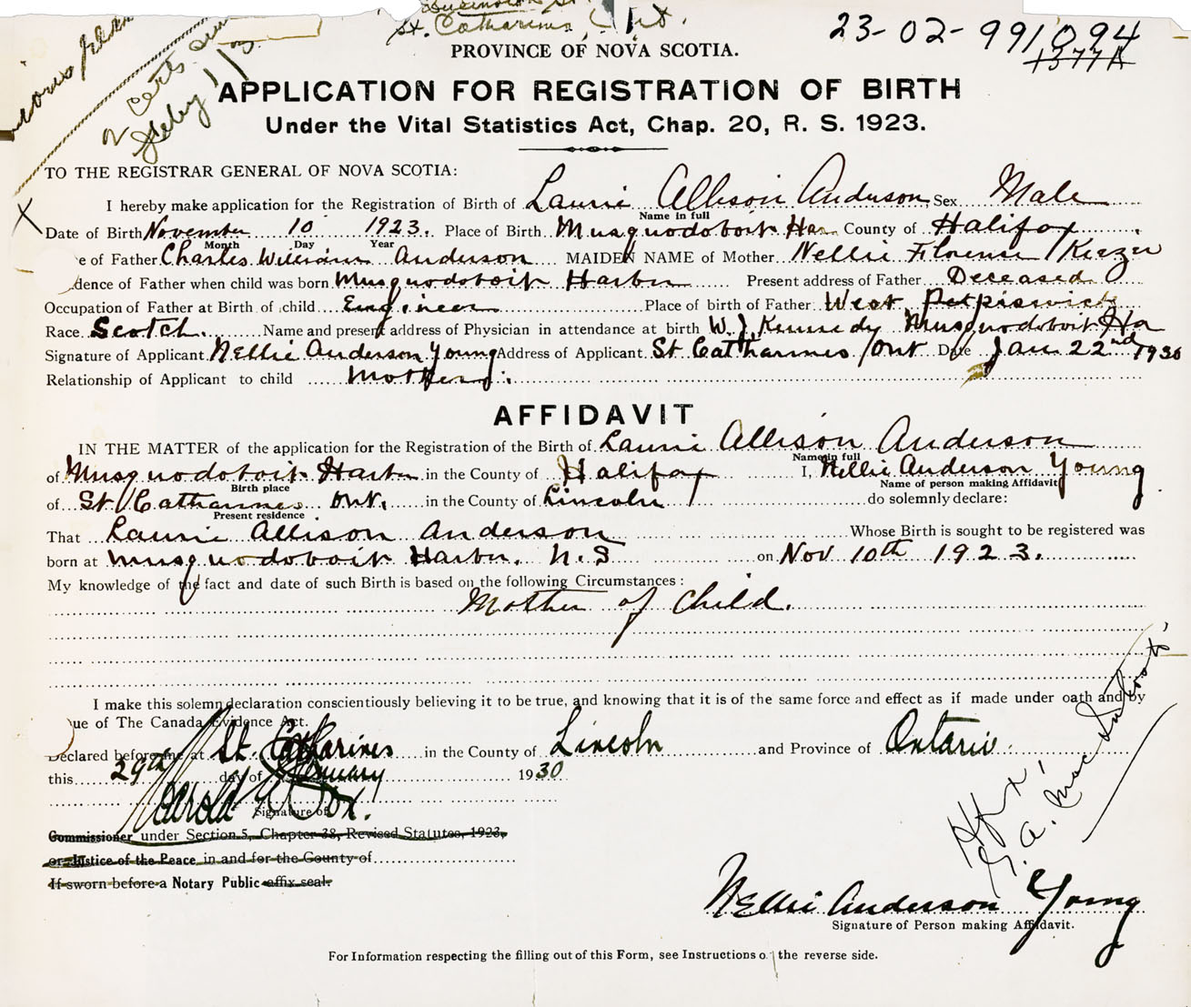 I hereby make application for the Registration of Birth of Laurie AllisonAnderson Sex Male