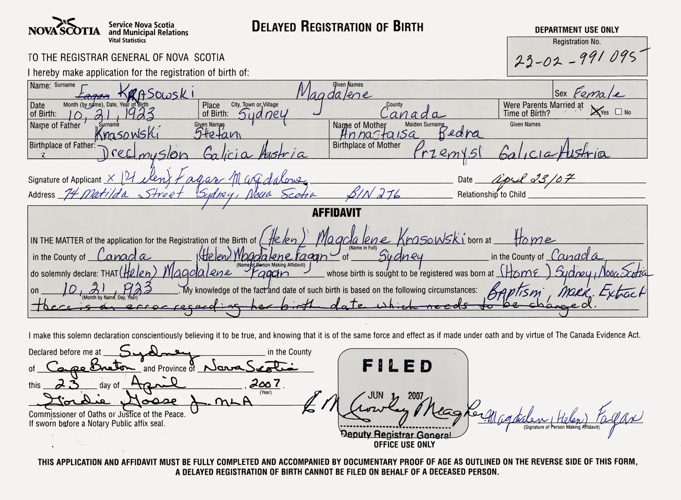 Female Birth Registration: Year: 1923 number: 99100095