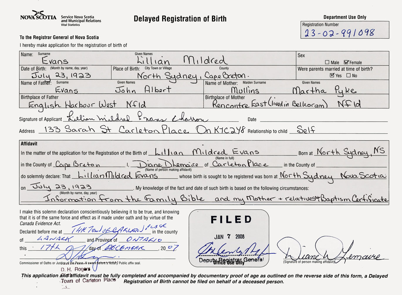 Signature of Applicant Lillian Mildred Evans Charron Address of Applicant 133 Sarah St. Carleton Place, Ontario Date December 17, 2007