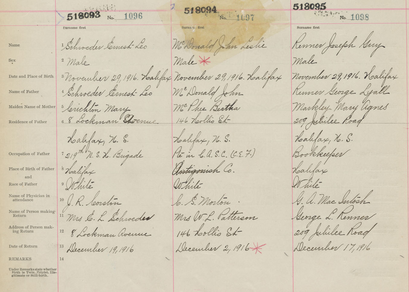Male Birth Registration: Year: 1916 number: 51800095