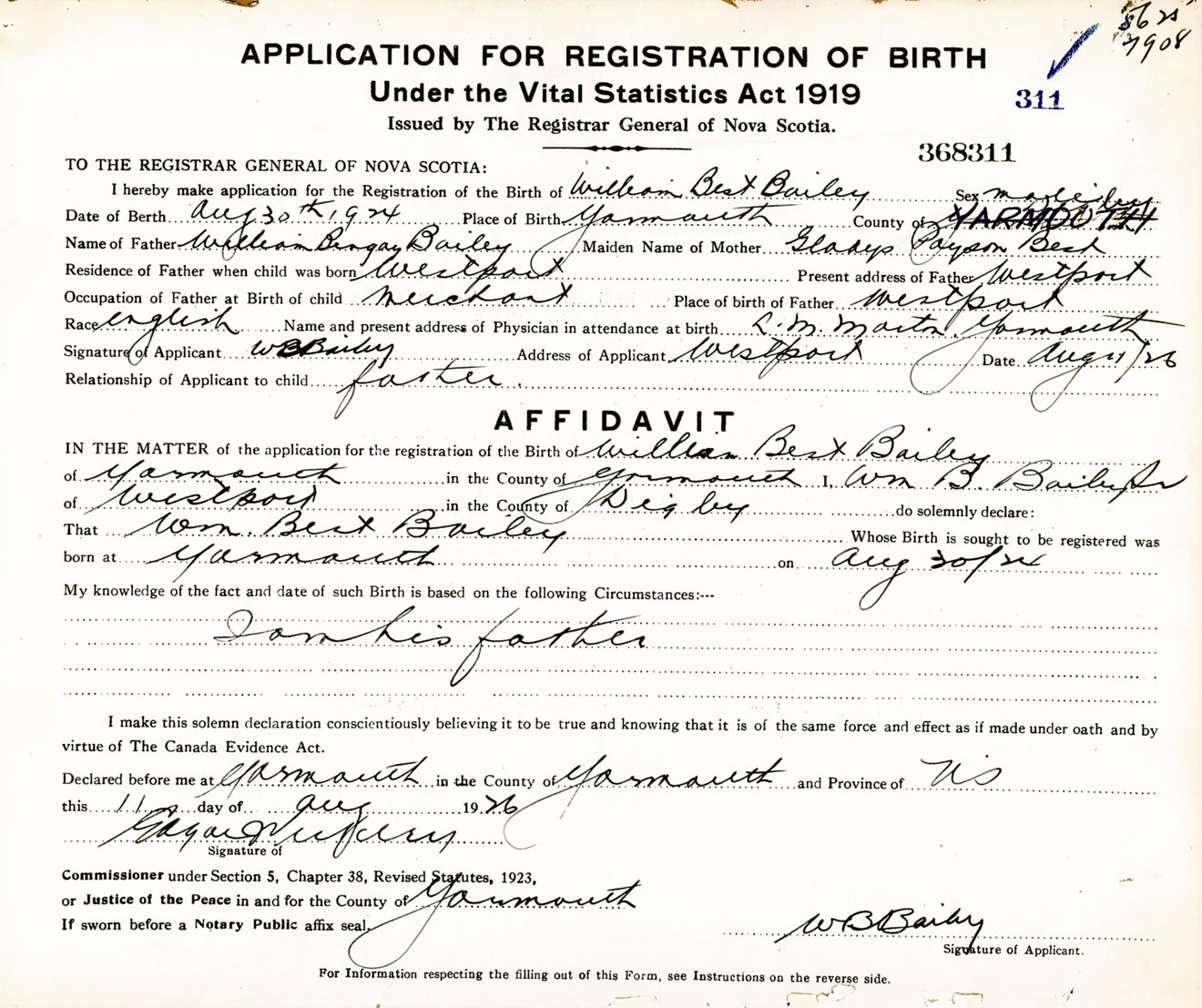 Signature of Applicant W. B. Bailey Address of Applicant Westport, Digby Co., NS Date 11 August 1926