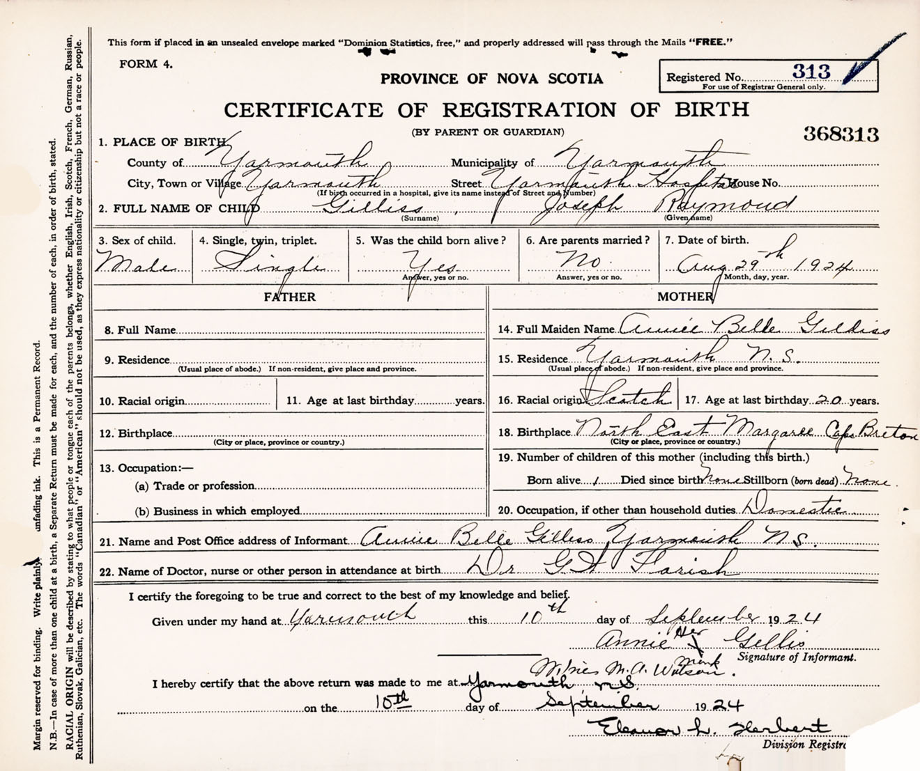 Date of Birth August 29, 1924 Place of Birth YarmouthCounty of Yarmouth