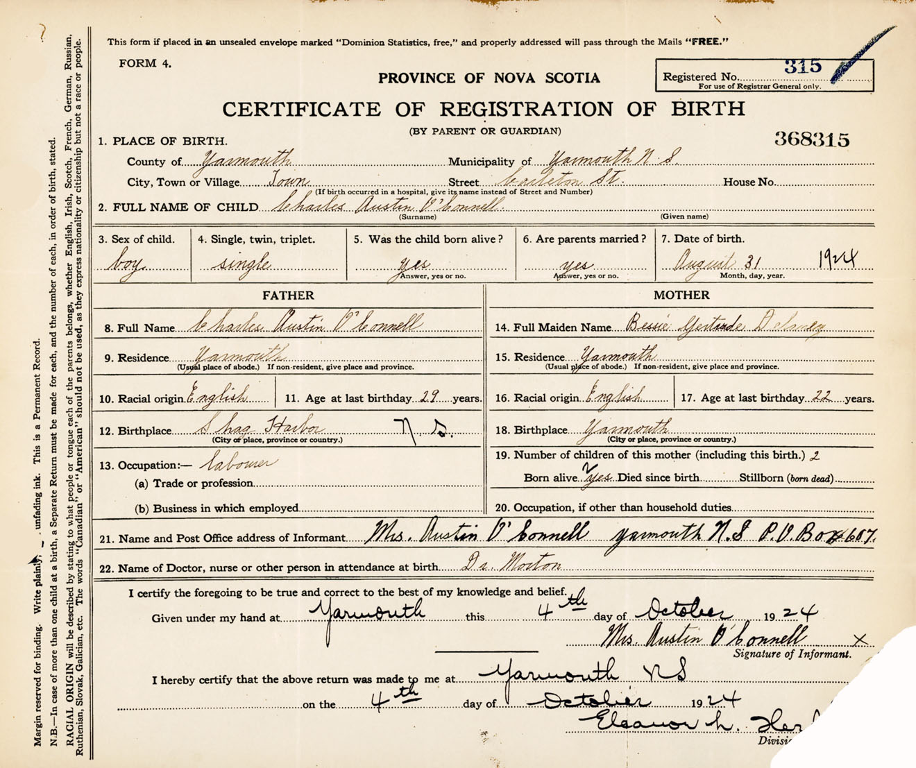 Date of Birth August 31, 1924 Place of Birth YarmouthCounty of Yarmouth