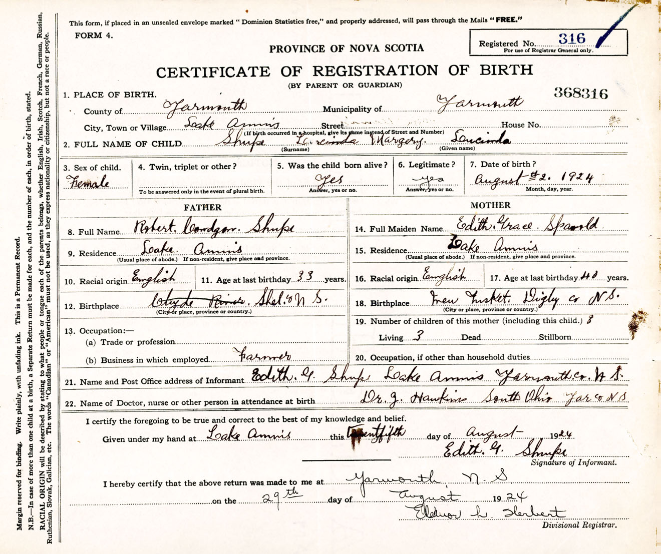 Date of Birth August 2, 1924 Place of Birth Lake AnnisCounty of Yarmouth