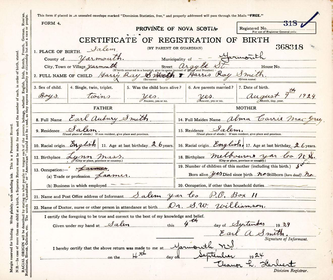 Date of Birth August 9, 1924 Place of Birth SalemCounty of Yarmouth