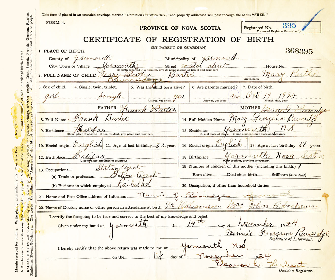 Female Birth Registration: Year: 1924 number: 36800395