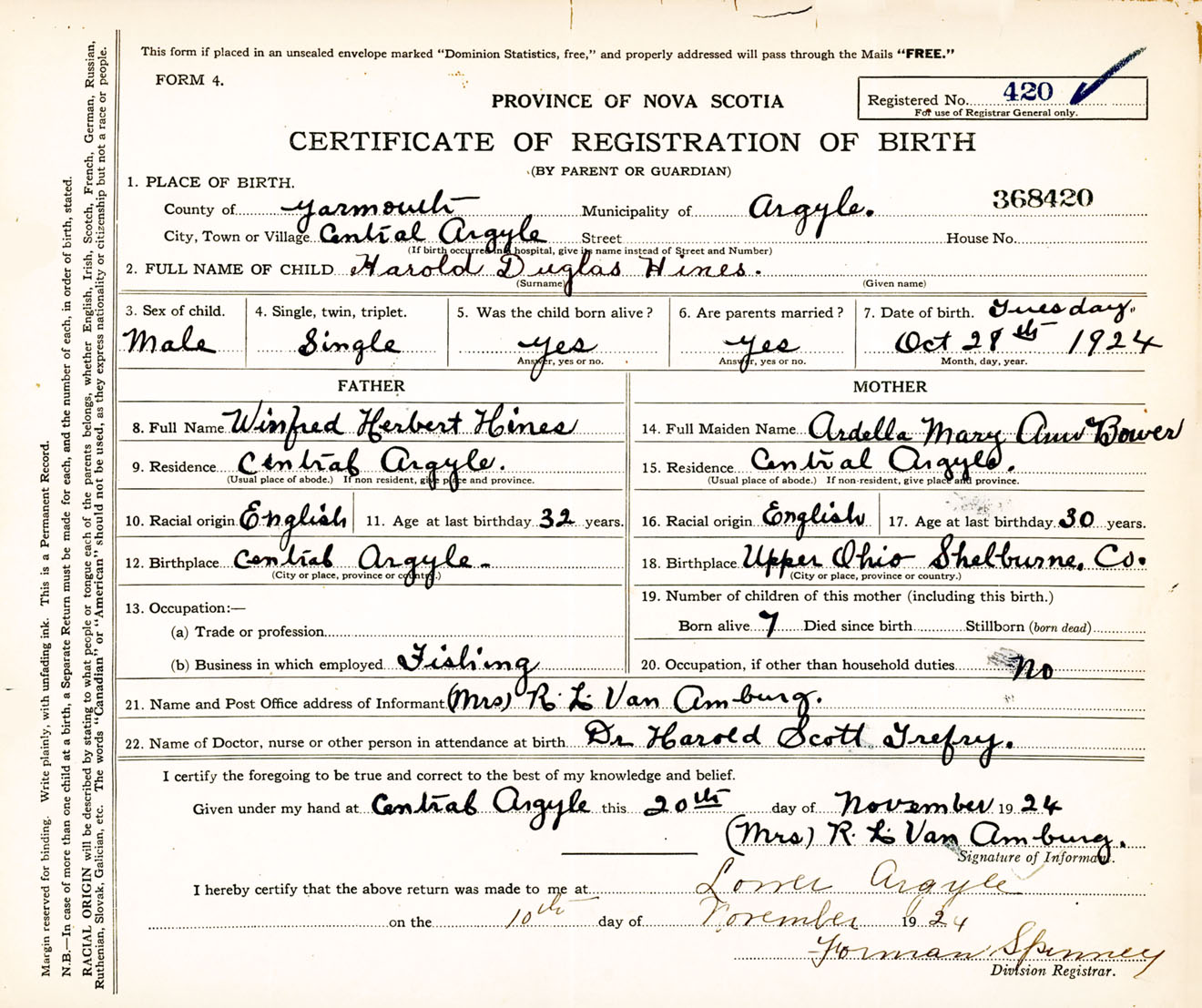 Male Birth Registration: Year: 1924 number: 36800420