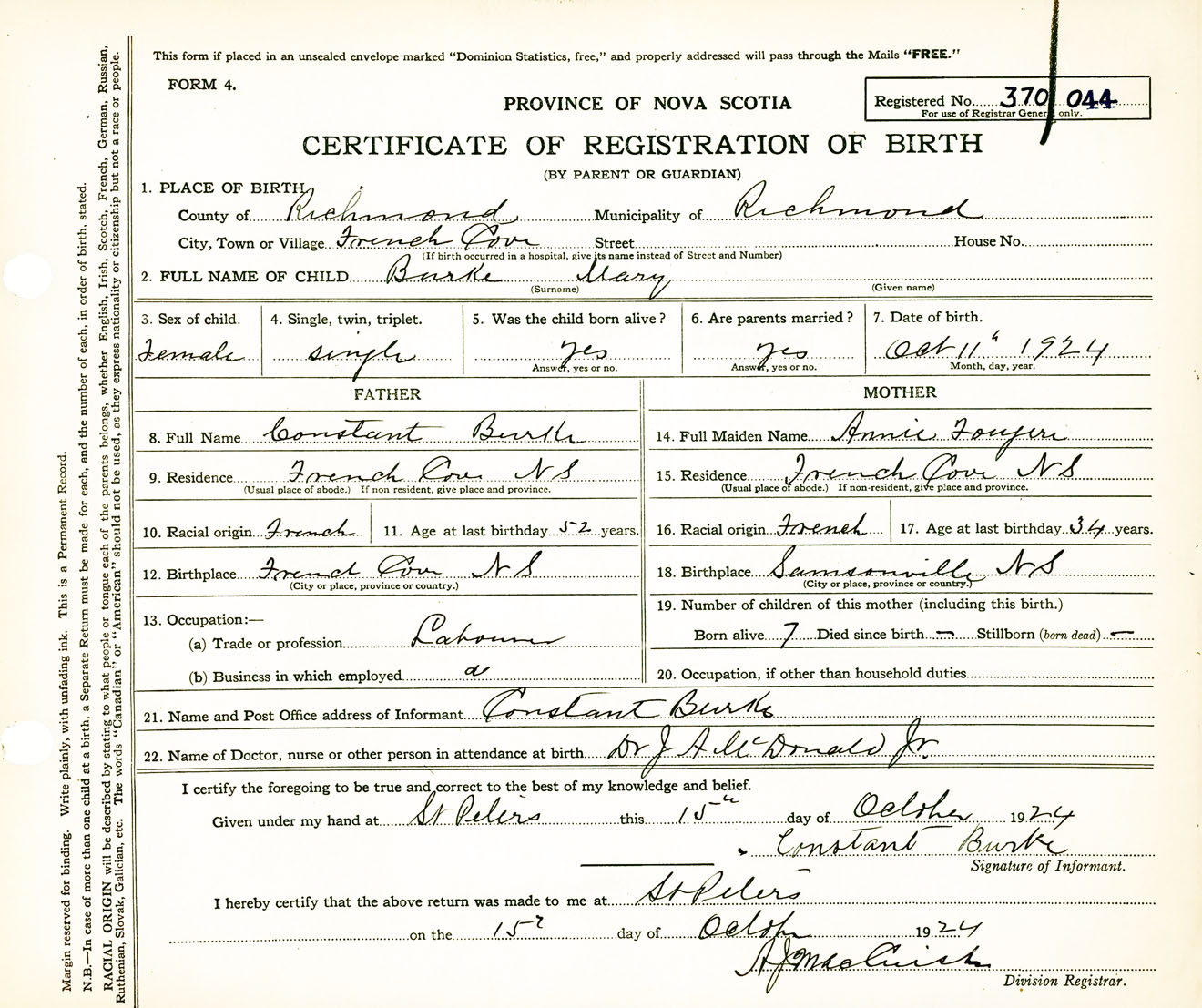 Female Birth Registration: Year: 1924 number: 37000044