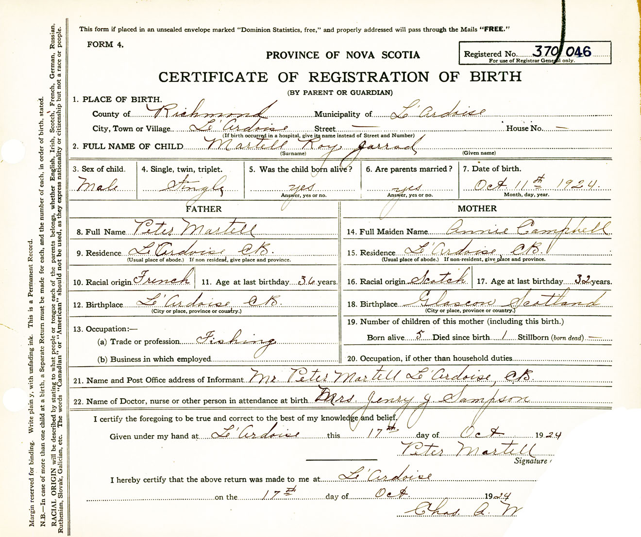 Male Birth Registration: Year: 1924 number: 37000046