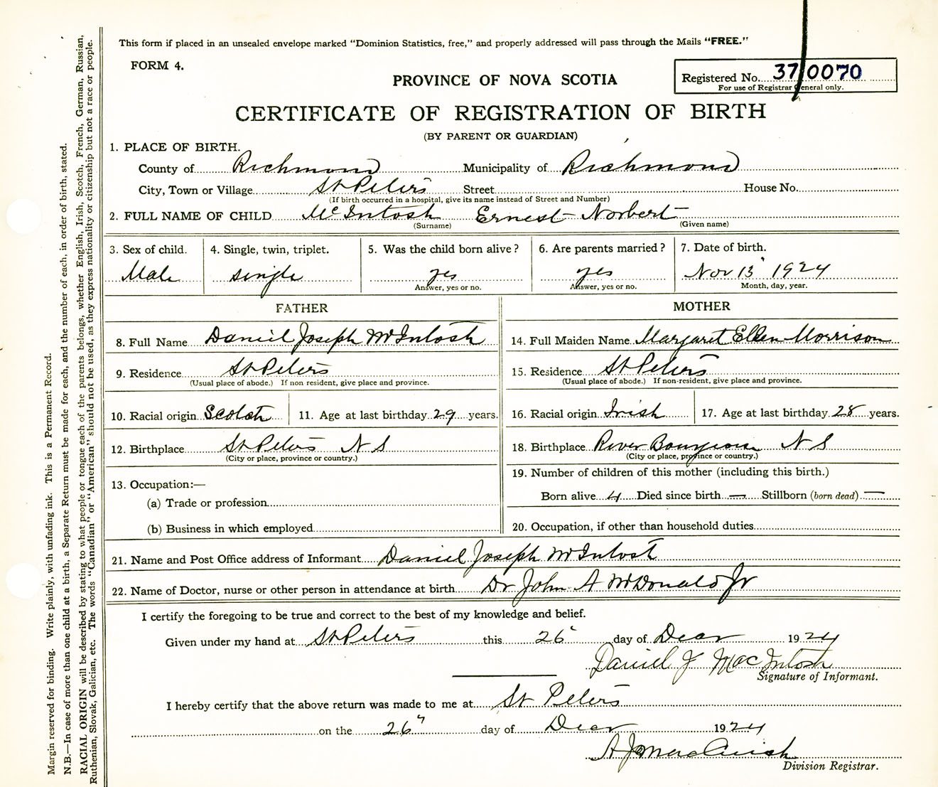 Male Birth Registration: Year: 1924 number: 37000070