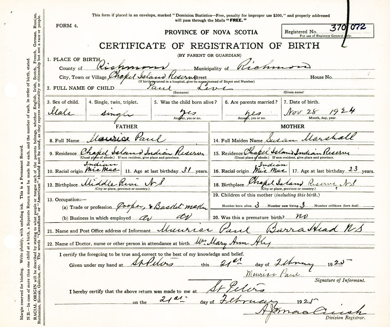Male Birth Registration: Year: 1924 number: 37000072