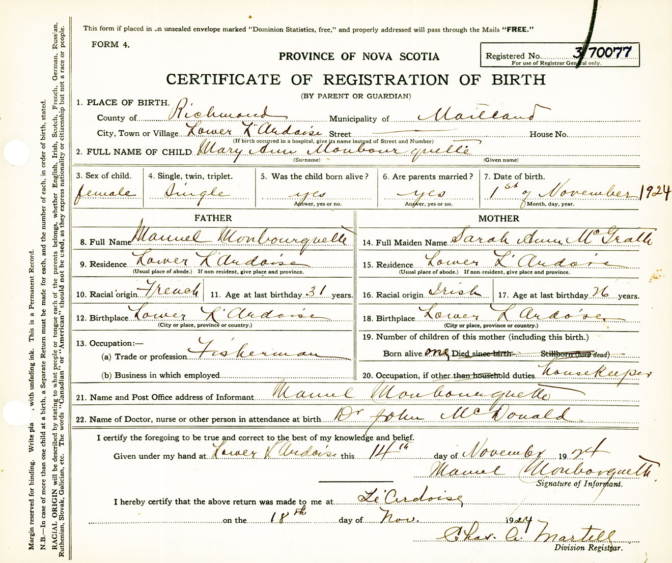 Female Birth Registration: Year: 1924 number: 37000077
