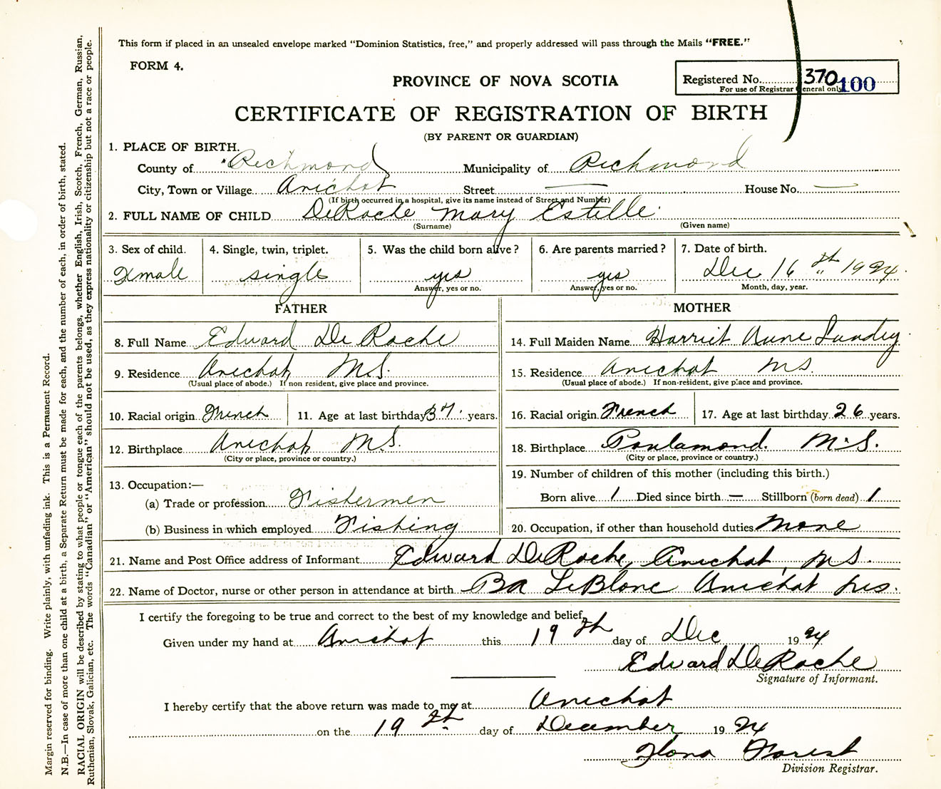 Female Birth Registration: Year: 1924 number: 37000100