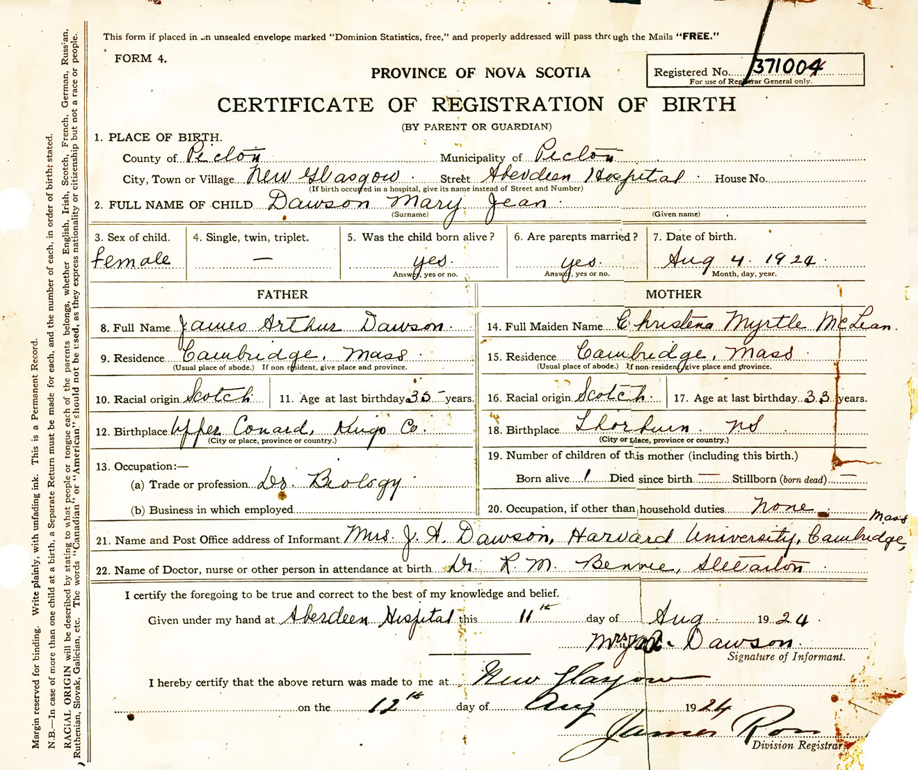 Female Birth Registration: Year: 1924 number: 37100004
