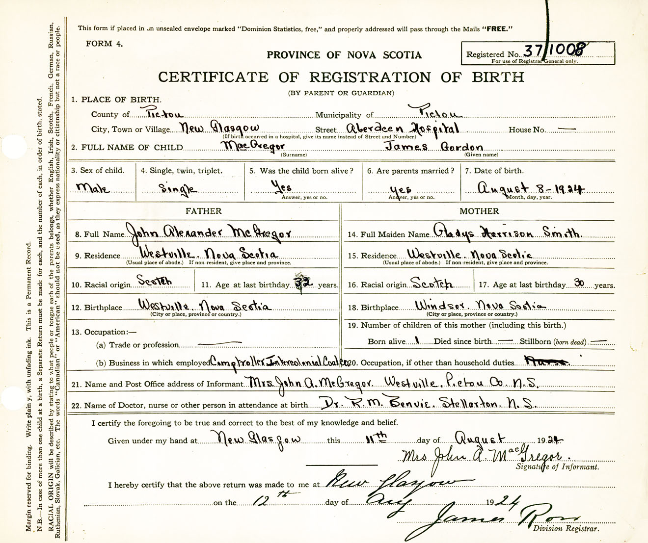 Male Birth Registration: Year: 1924 number: 37100008