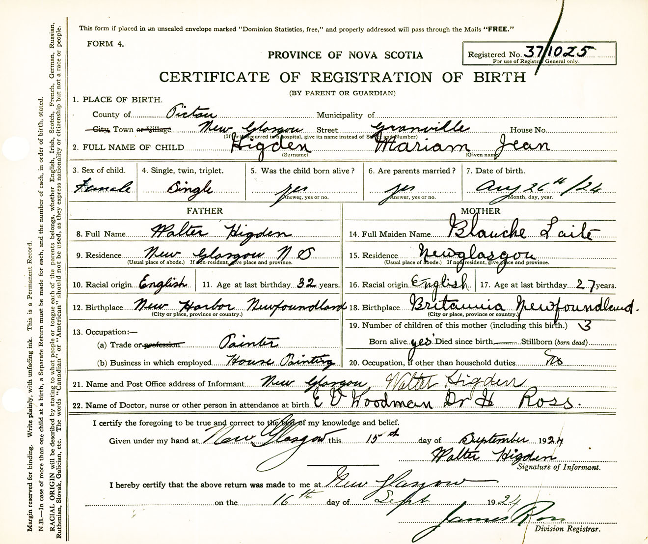 Female Birth Registration: Year: 1924 number: 37100025