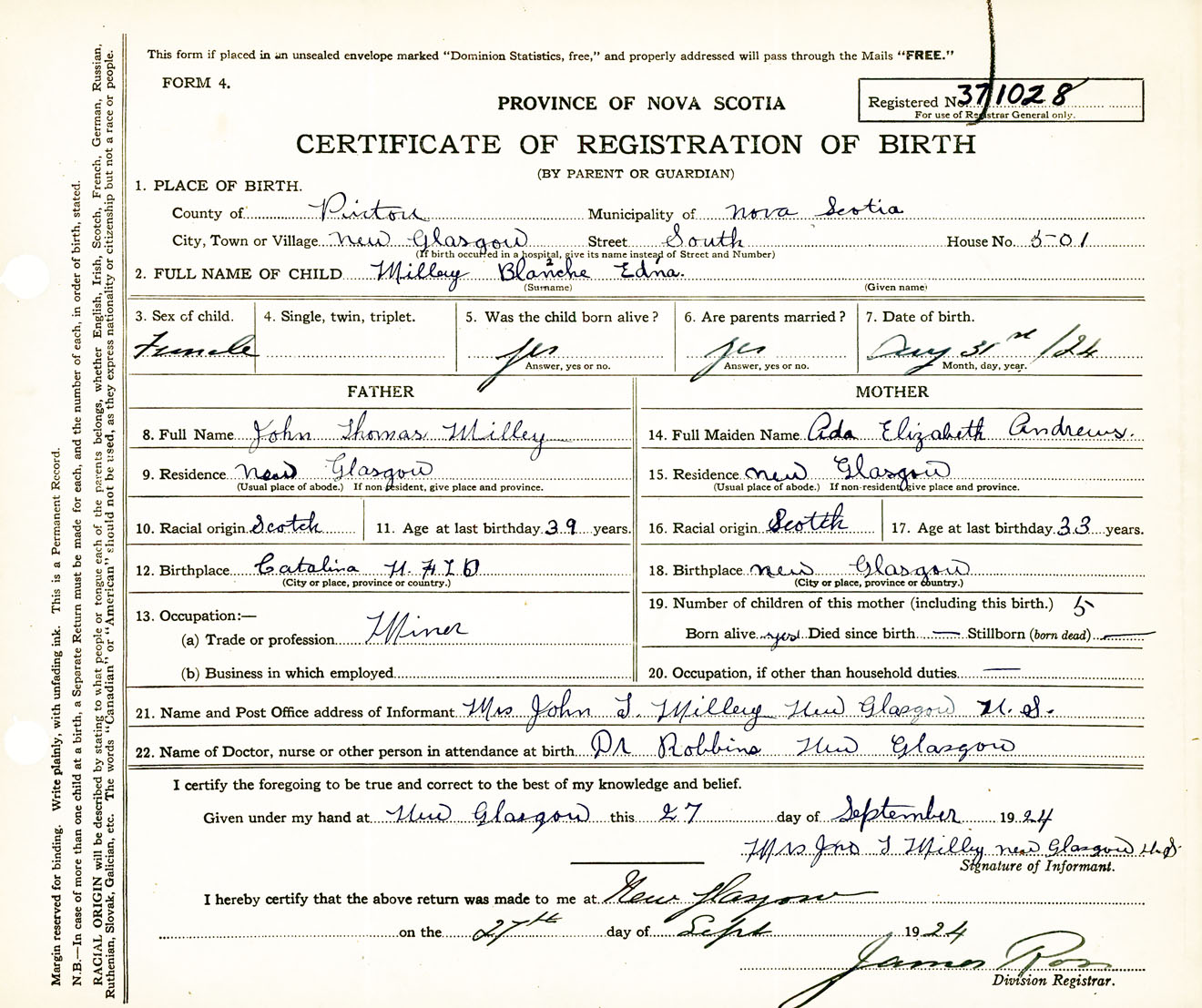 Female Birth Registration: Year: 1924 number: 37100028