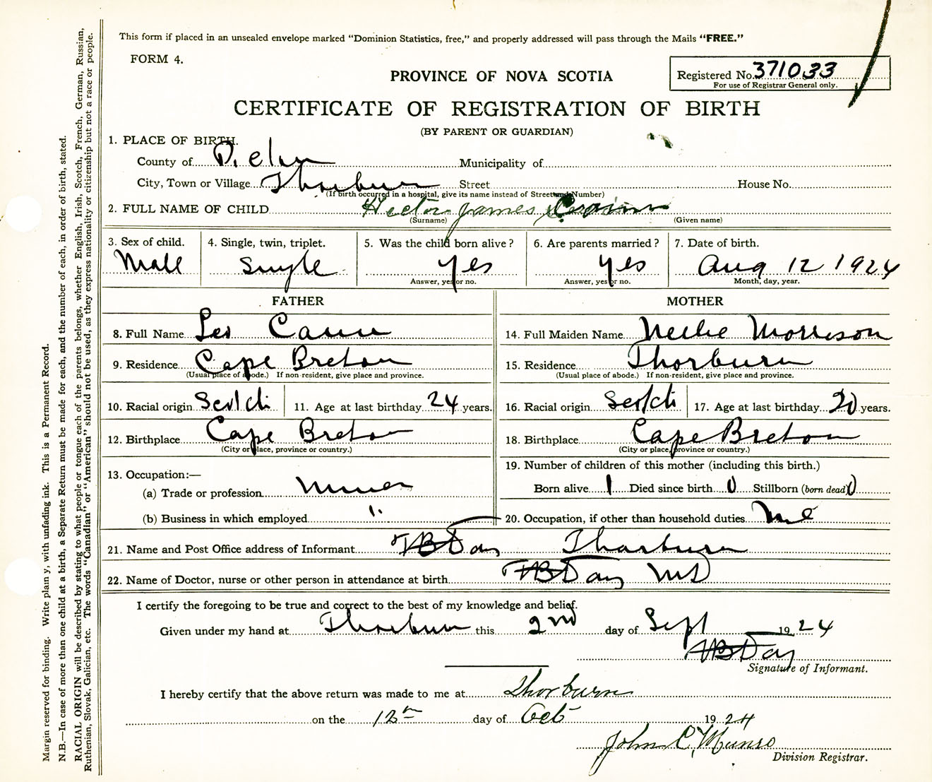 Male Birth Registration: Year: 1924 number: 37100033