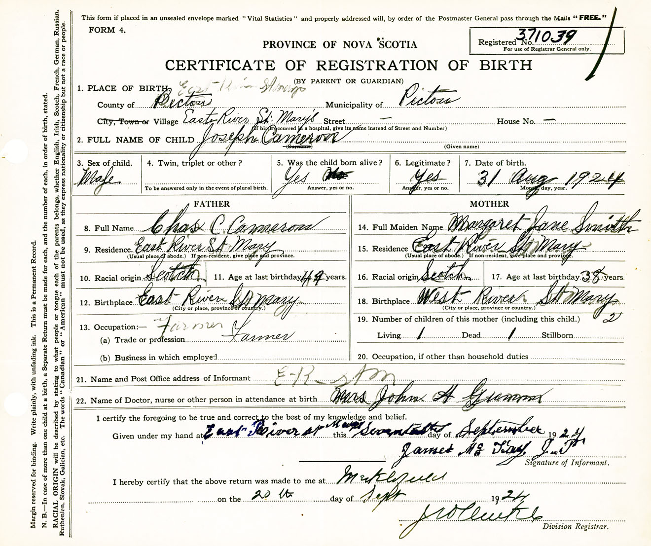 Male Birth Registration: Year: 1924 number: 37100039