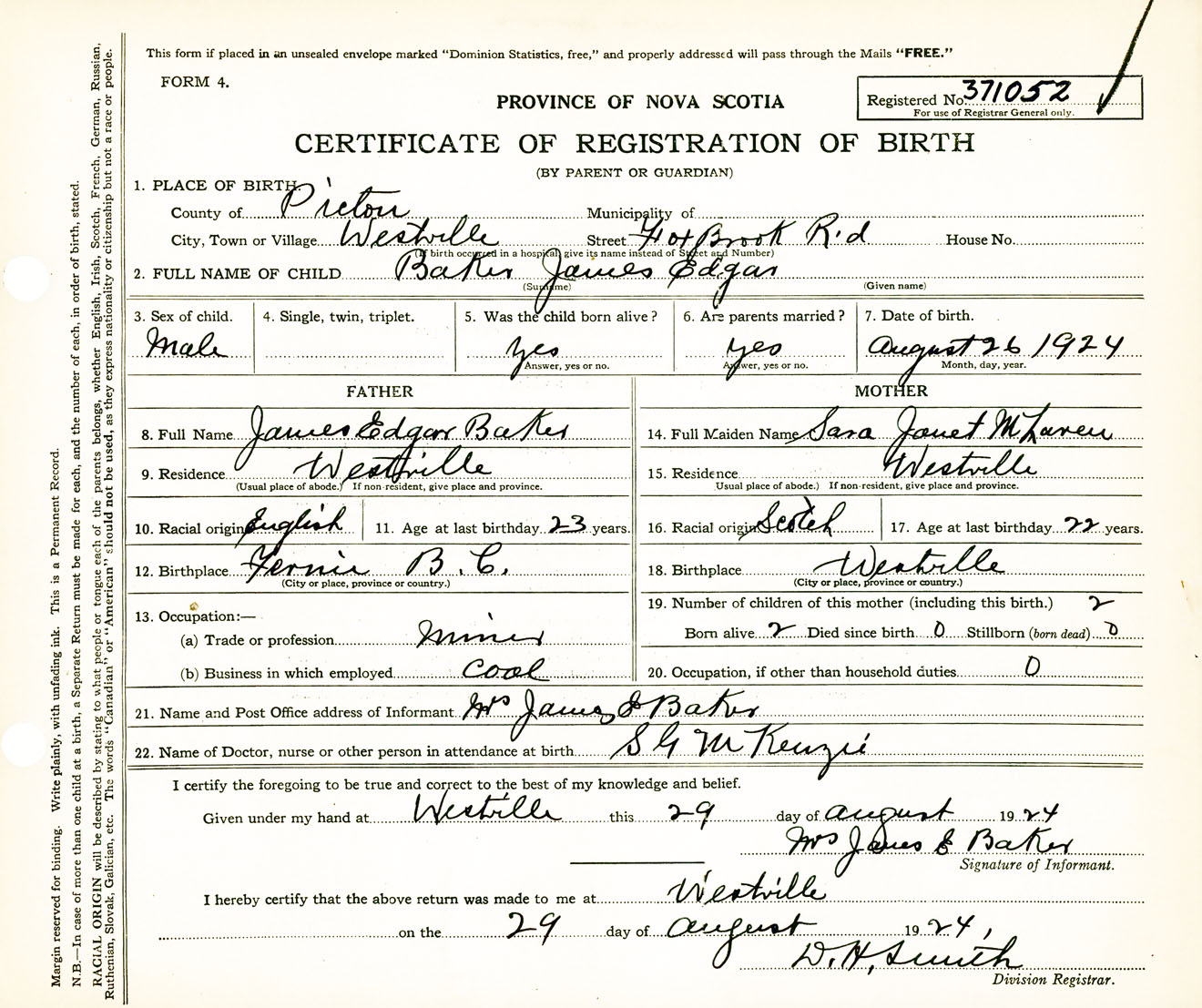 Male Birth Registration: Year: 1924 number: 37100052