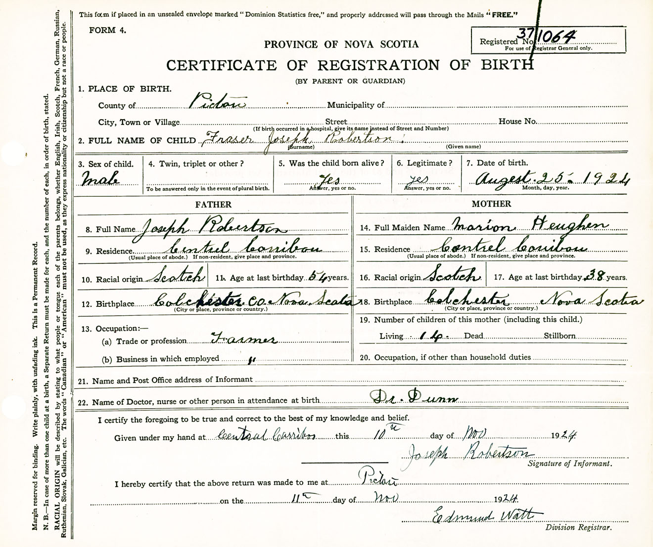Male Birth Registration: Year: 1924 number: 37100064