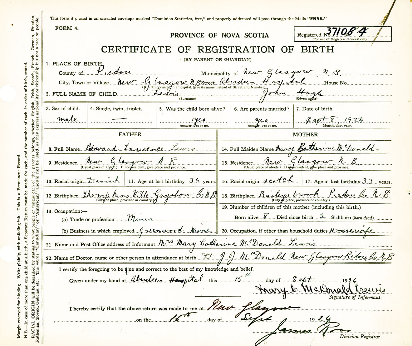 Male Birth Registration: Year: 1924 number: 37100084