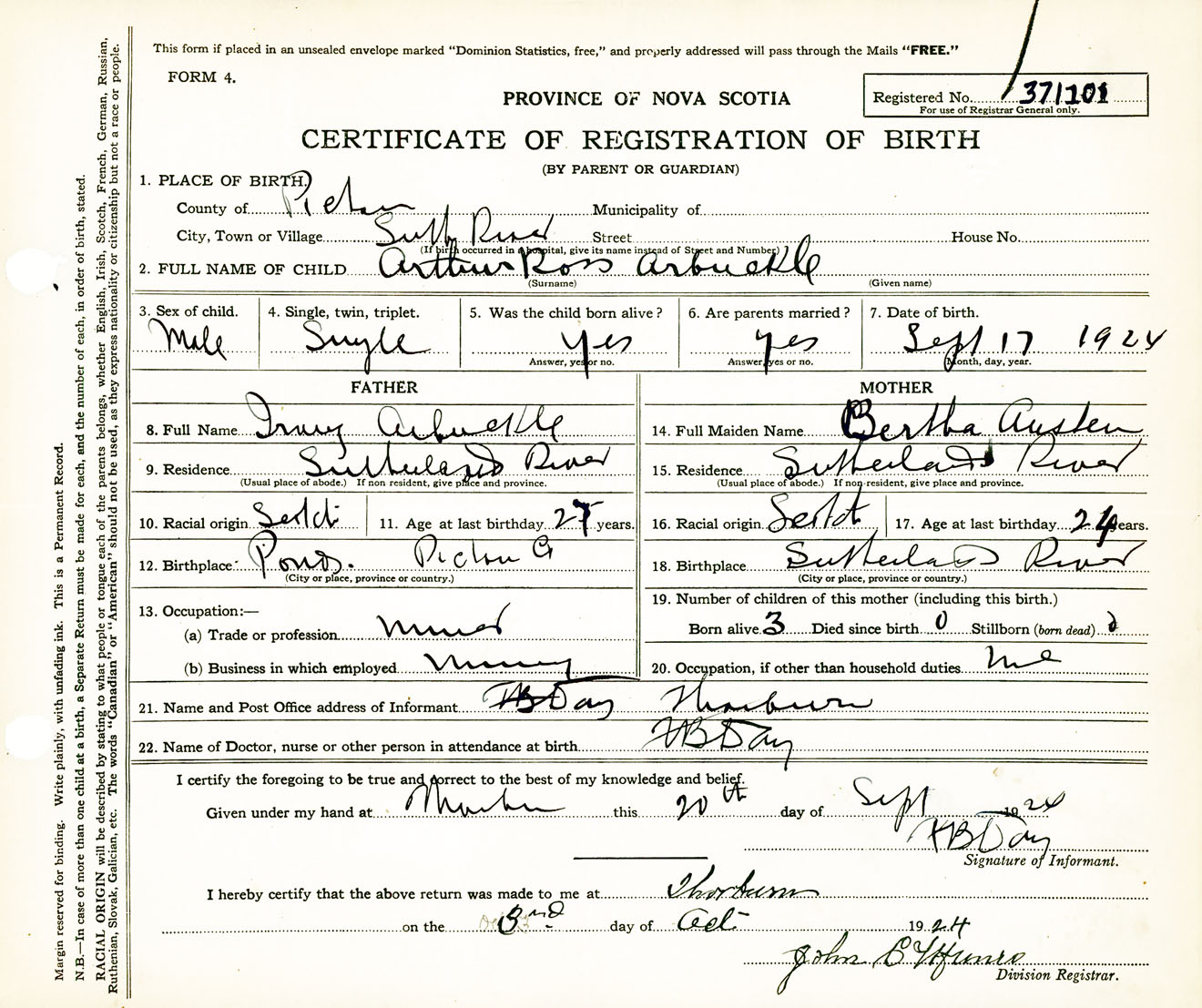 Male Birth Registration: Year: 1924 number: 37100101