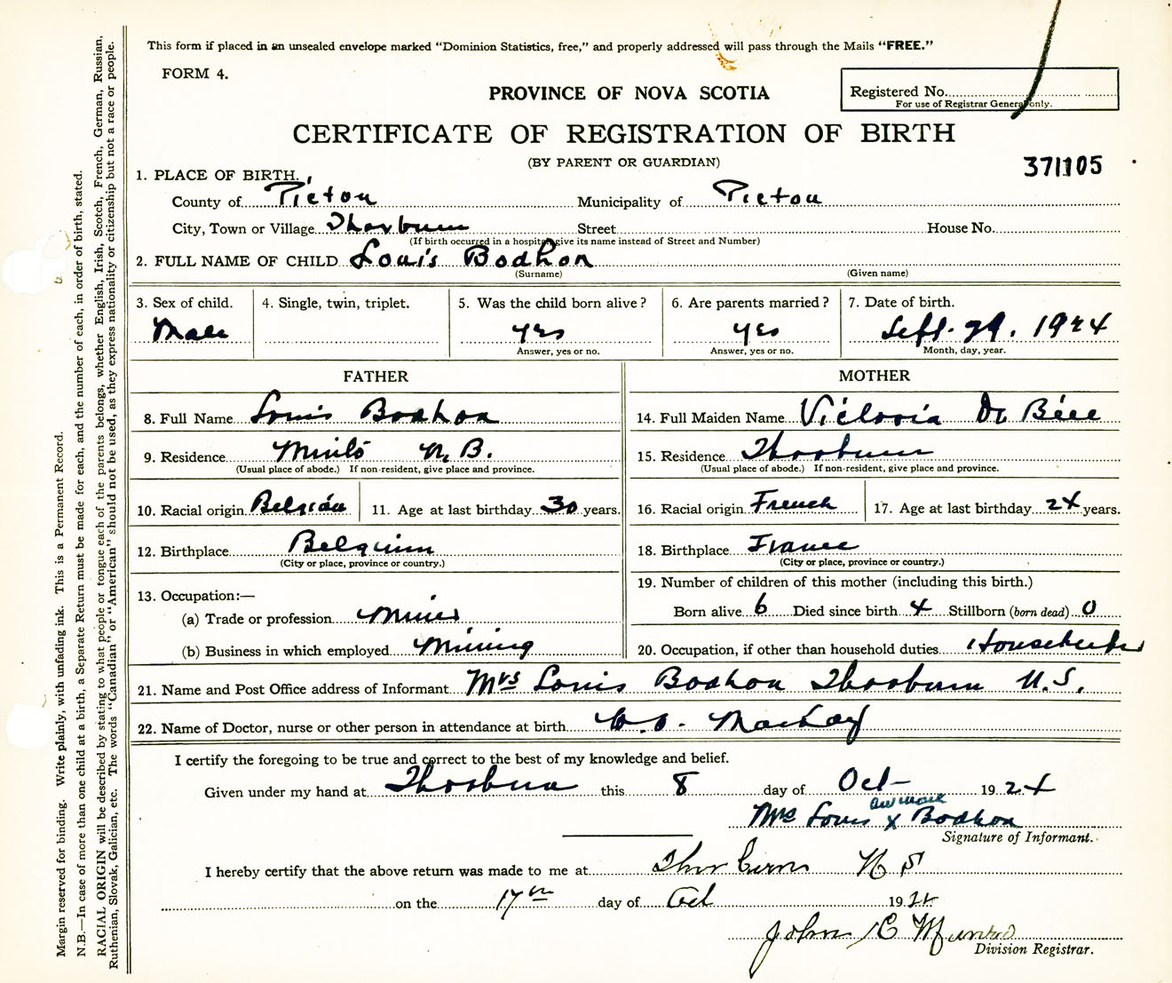 Male Birth Registration: Year: 1924 number: 37100105
