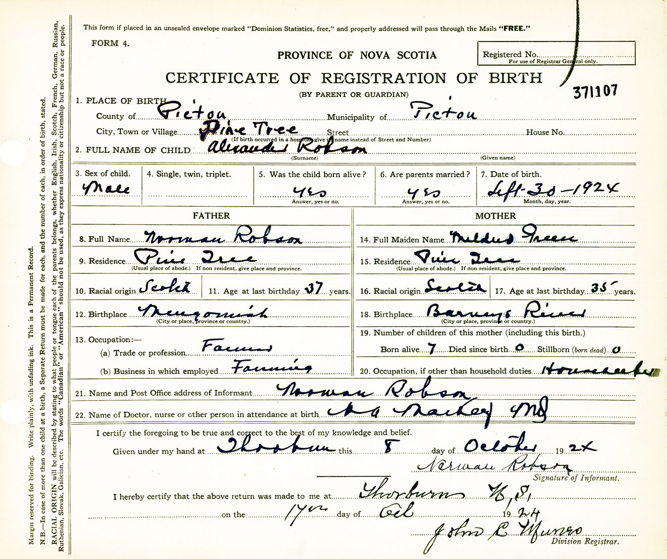 Male Birth Registration: Year: 1924 number: 37100107