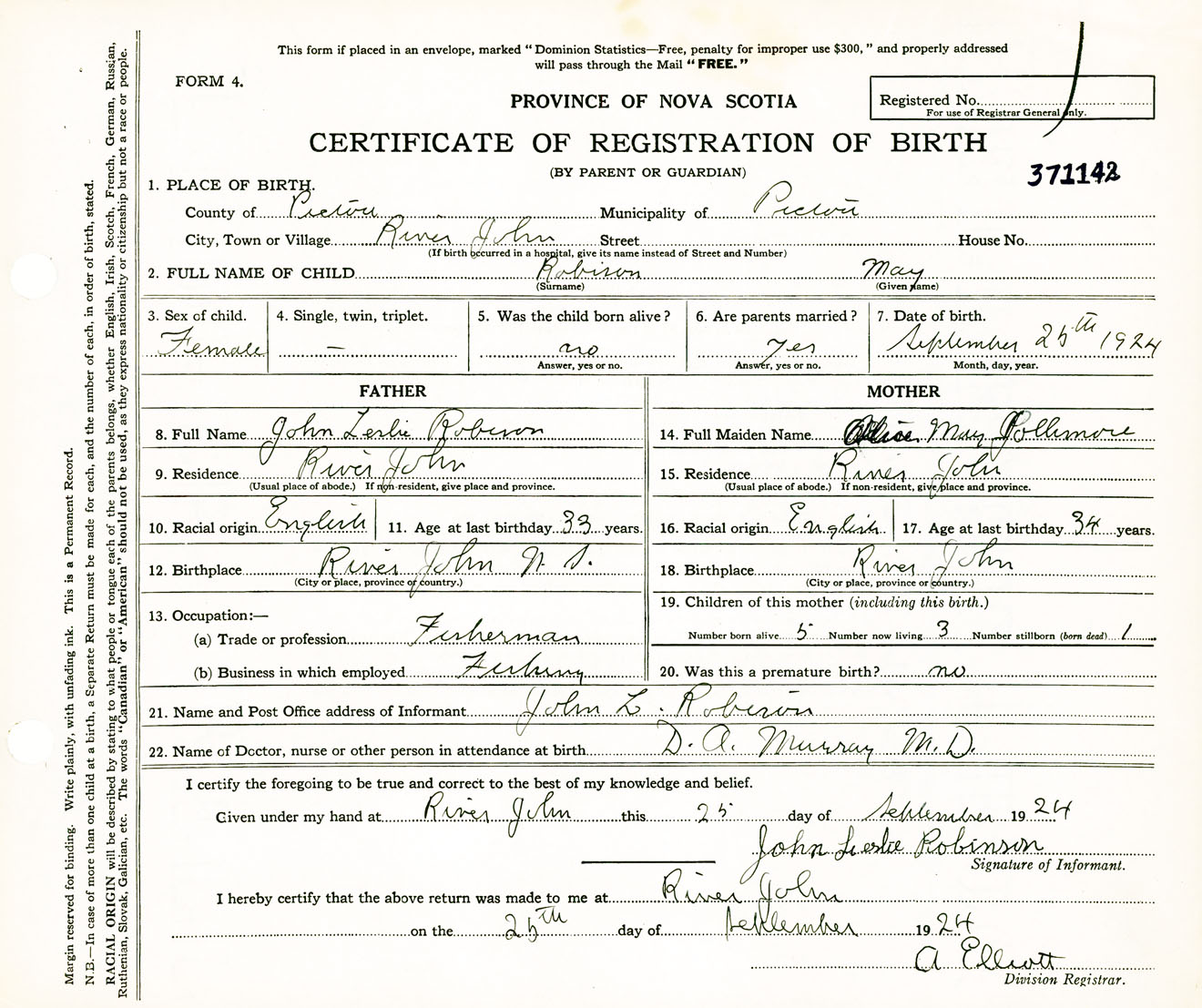 Female Birth Registration: Year: 1924 number: 37100142