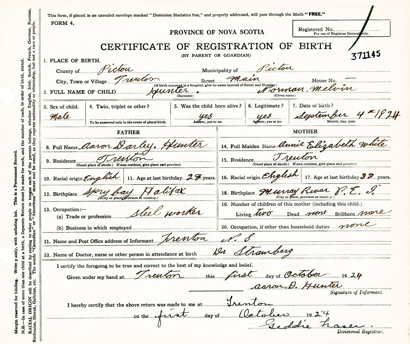 Male Birth Registration: Year: 1924 number: 37100145