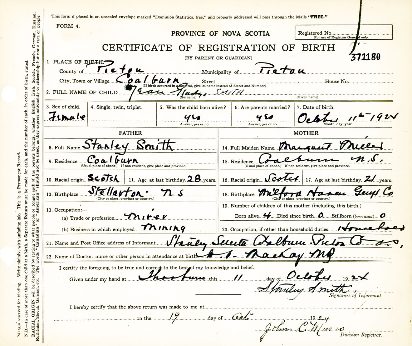 Female Birth Registration: Year: 1924 number: 37100180