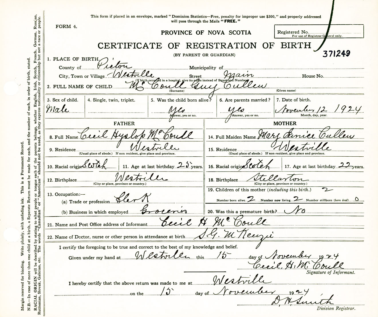 Male Birth Registration: Year: 1924 number: 37100249