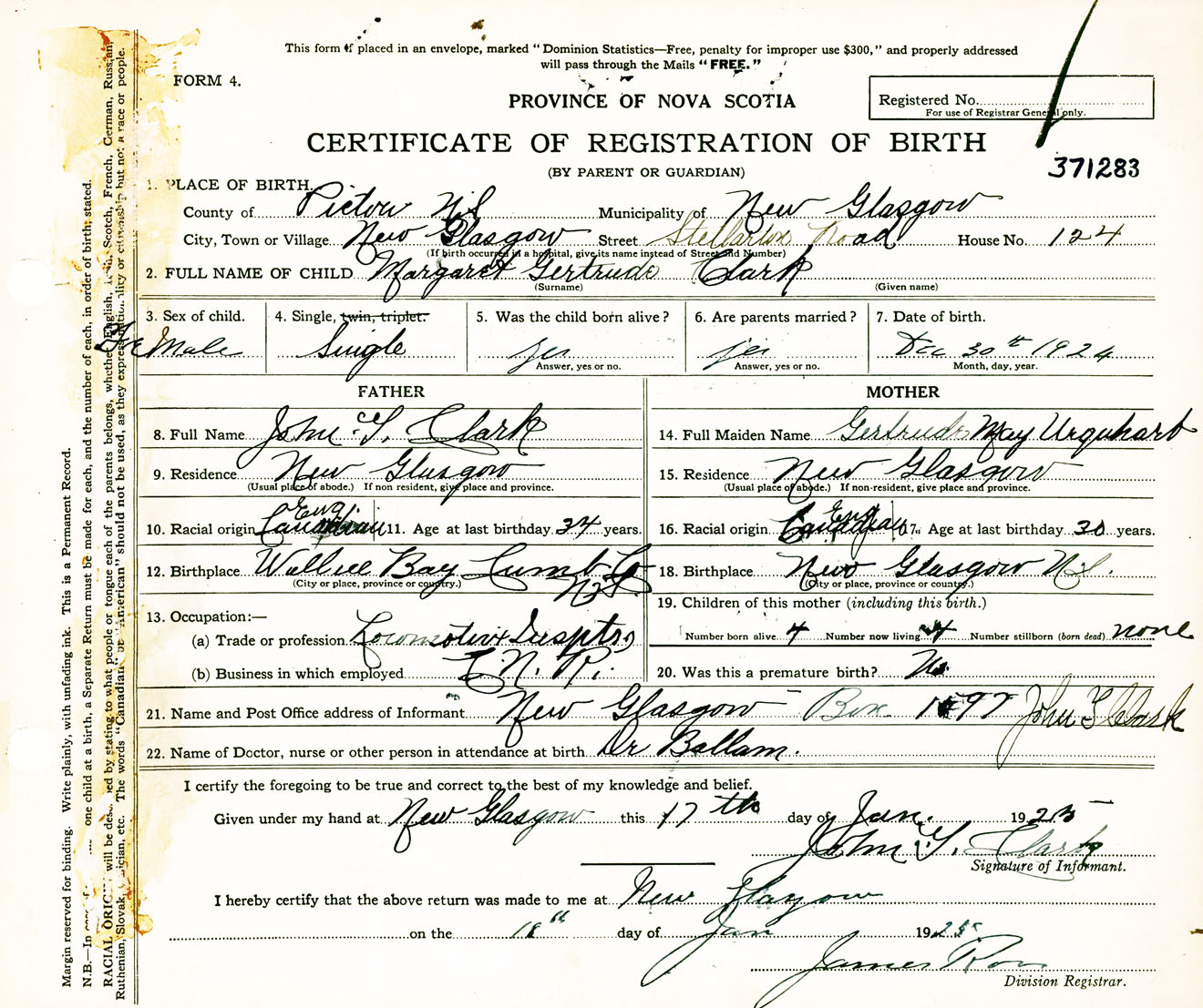 Female Birth Registration: Year: 1924 number: 37100283