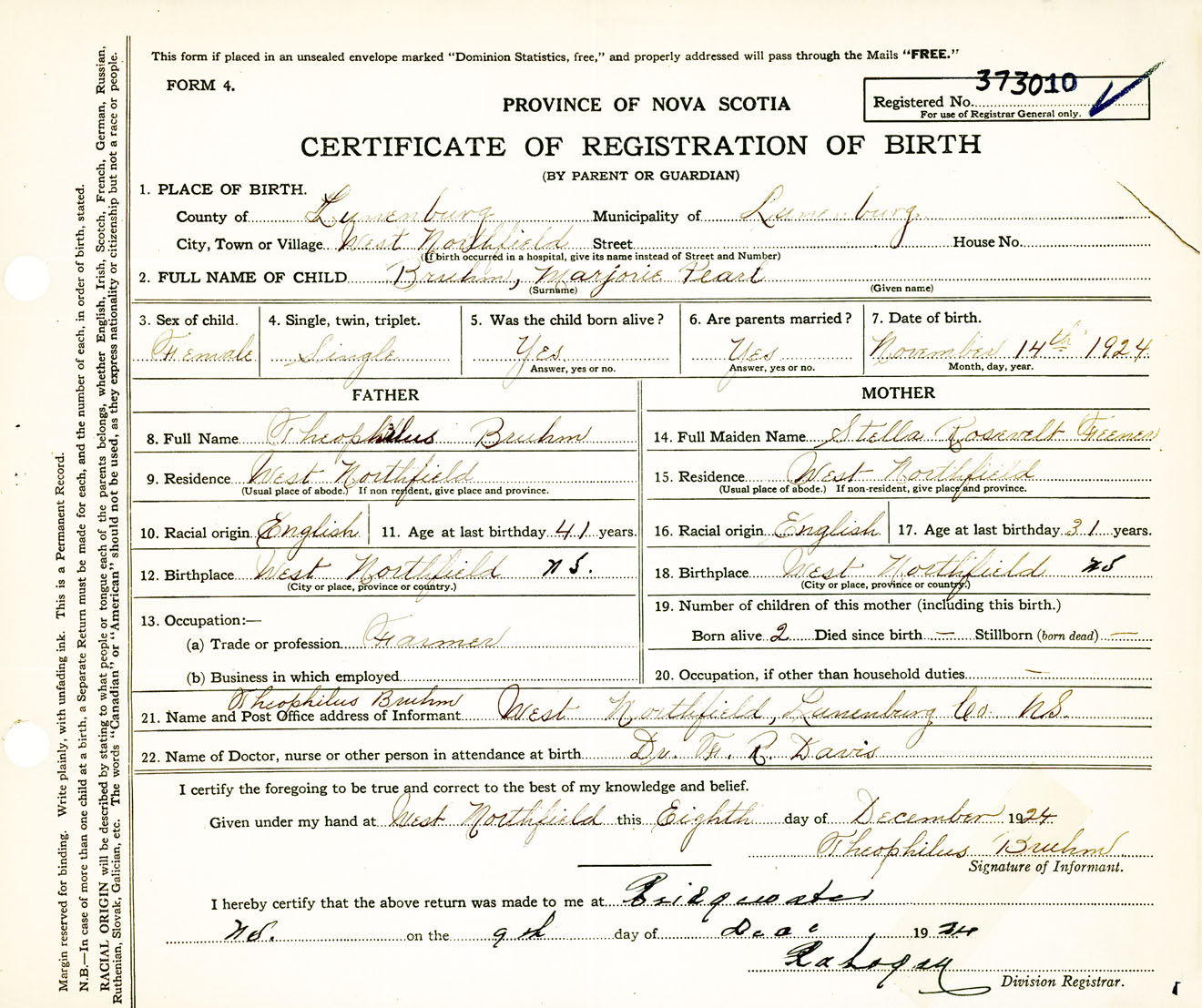 Female Birth Registration: Year: 1924 number: 37300010