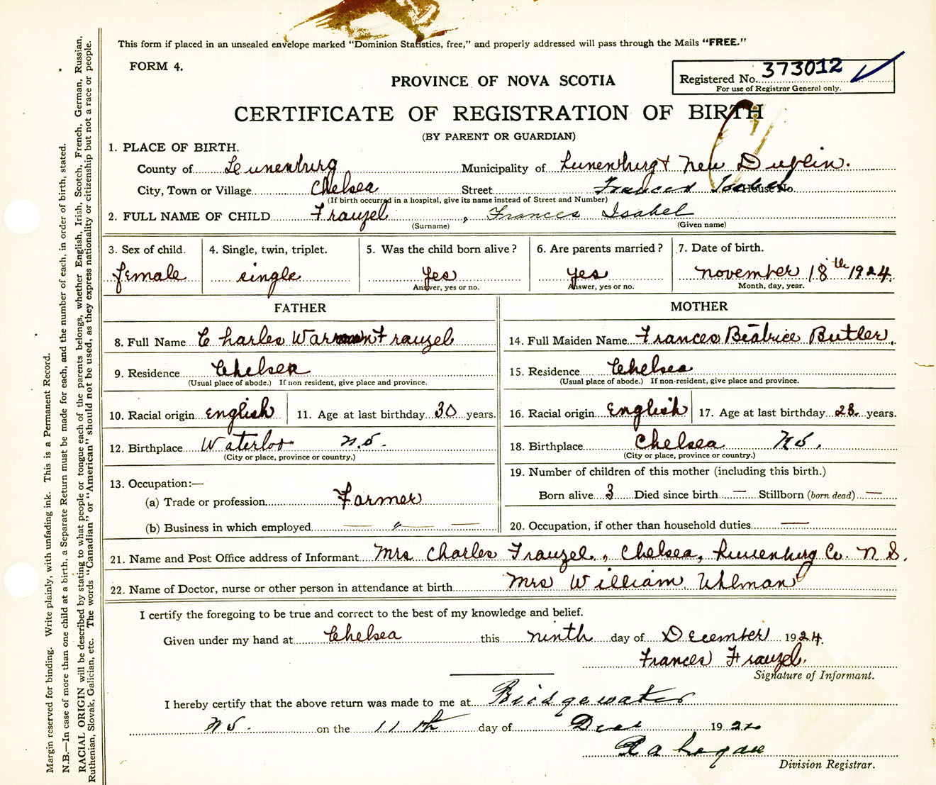 Female Birth Registration: Year: 1924 number: 37300012