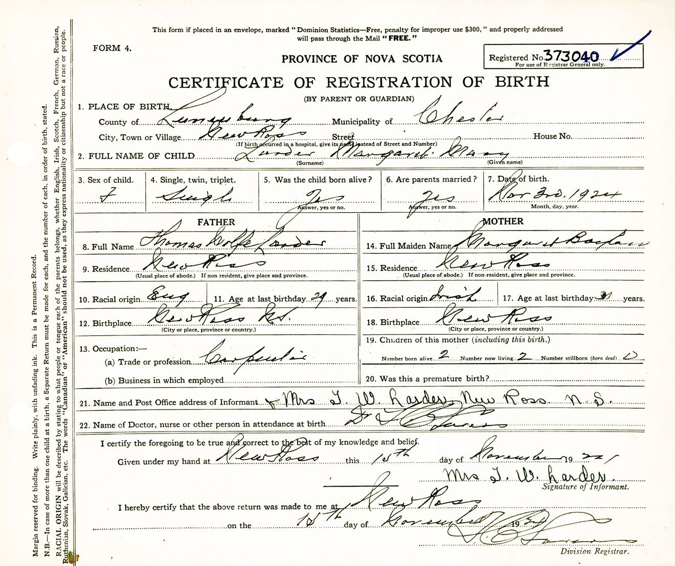 Female Birth Registration: Year: 1924 number: 37300040
