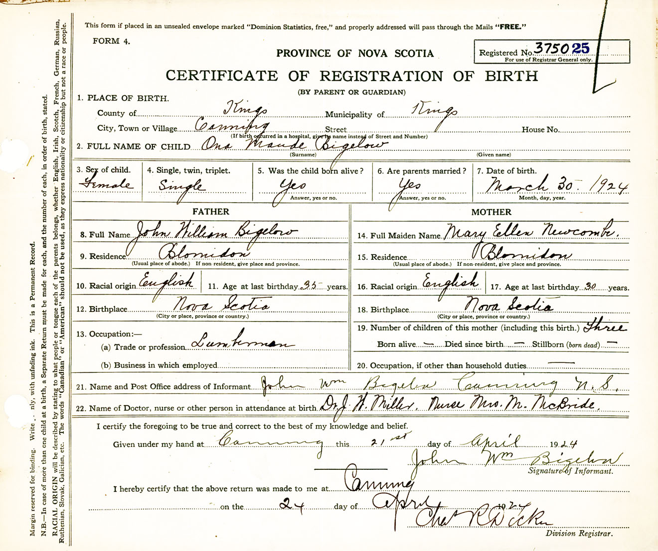 Female Birth Registration: Year: 1924 number: 37500025