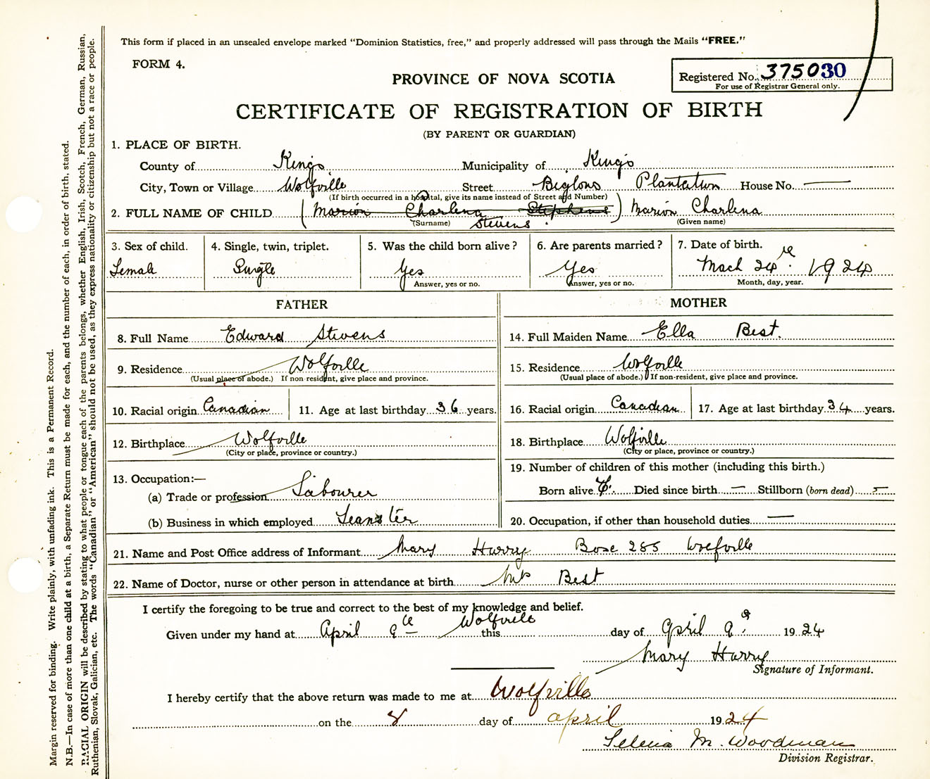Female Birth Registration: Year: 1924 number: 37500030