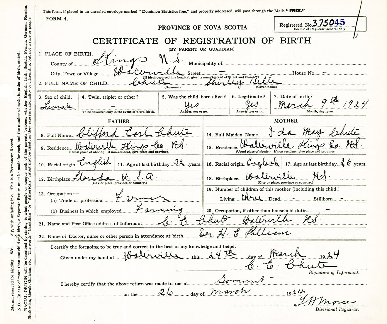 Female Birth Registration: Year: 1924 number: 37500045
