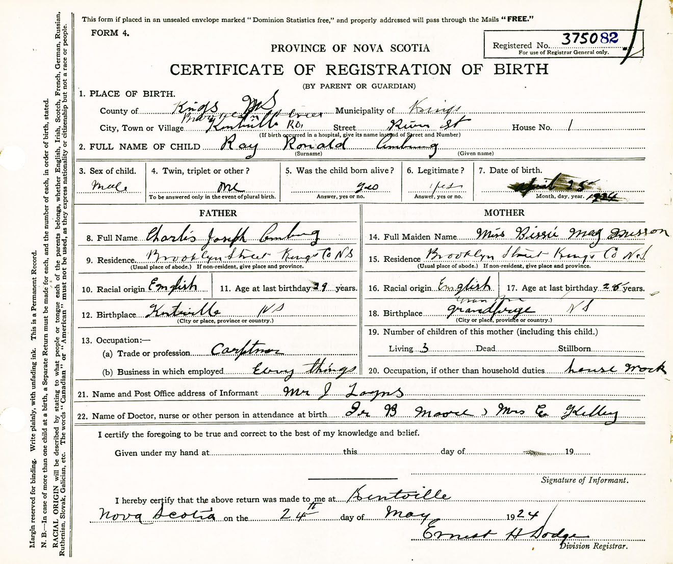 Male Birth Registration: Year: 1924 number: 37500082