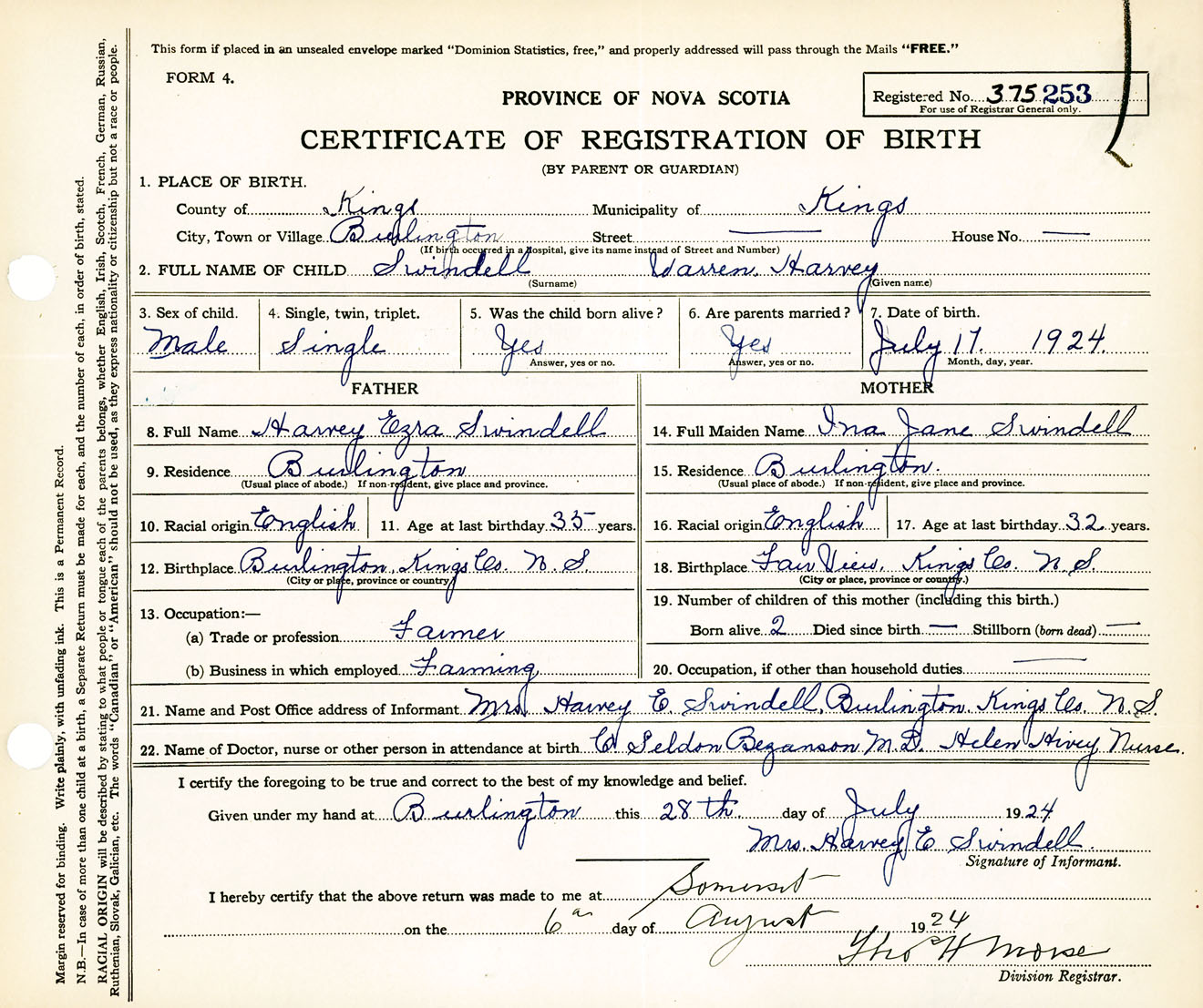 Male Birth Registration: Year: 1924 number: 37500253