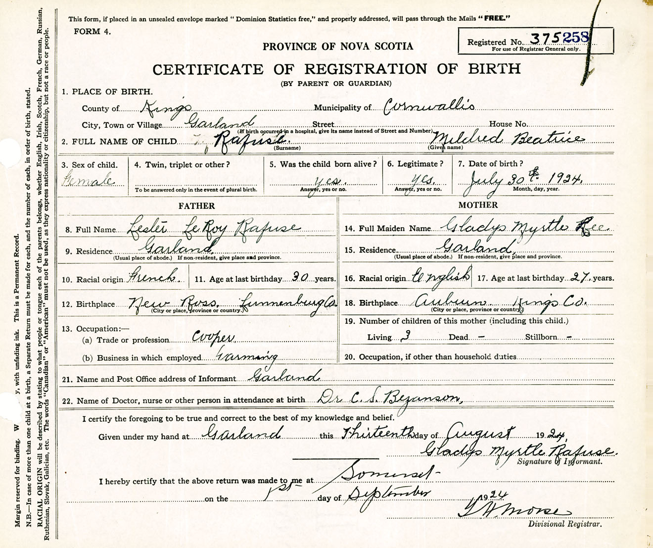 Female Birth Registration: Year: 1924 number: 37500258