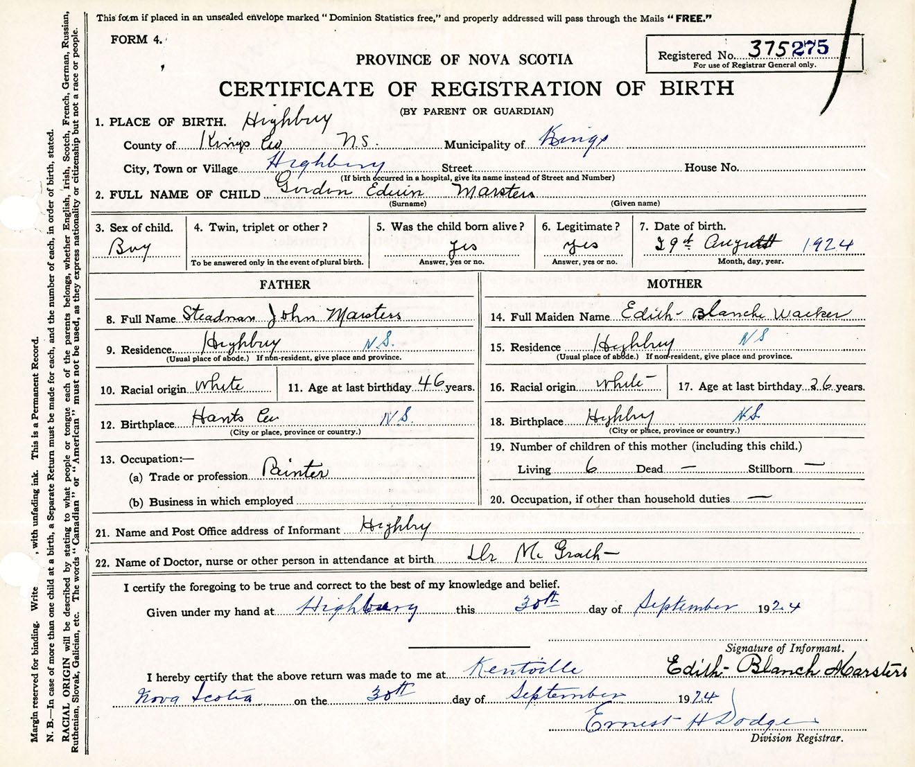 Male Birth Registration: Year: 1924 number: 37500275