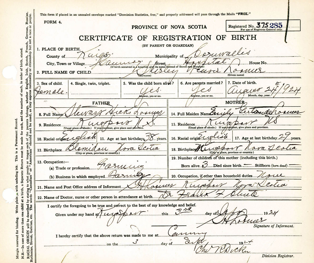 Female Birth Registration: Year: 1924 number: 37500285
