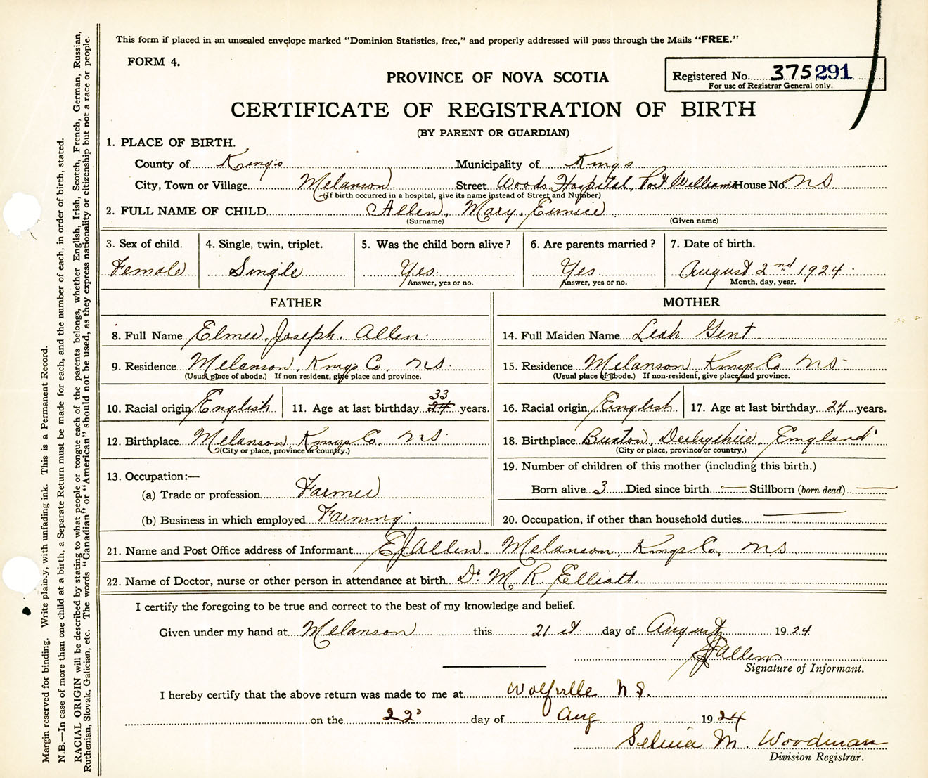 Female Birth Registration: Year: 1924 number: 37500291