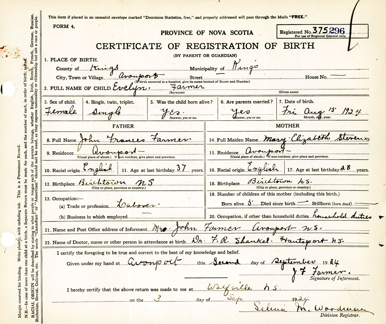 Female Birth Registration: Year: 1924 number: 37500296